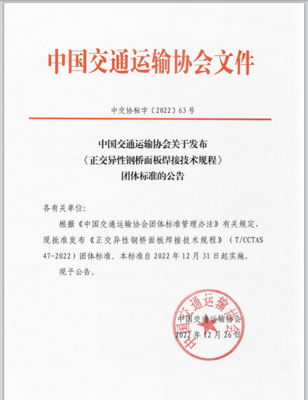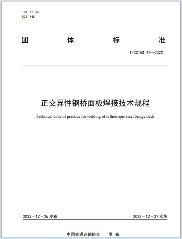 《正交異性鋼橋面板焊接技術規程》(T/CCTAS 47-2022)由中國交通運輸協會新技術促進分會提出,由中鐵寶橋(揚州)有限公司牽頭,聯合中鐵寶橋集團有限公司、蘇交科集團股份有限公司、 江蘇省交通工程建設局、江蘇省交通運輸廳公路事業發展中心、深中通道管理中心、中鐵武漢大橋工程 咨詢監理有限公司、中鐵九橋工程有限公司、中建鋼構江蘇有限公司、中交協聯交通科學研究院(北京) 有限公司等單位共同起草。于2022年12月26日發布,2022年12月31日起實施。