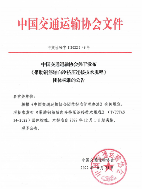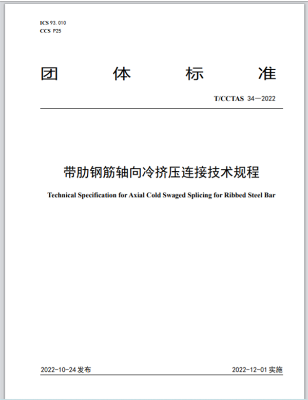 《帶肋鋼筋軸向冷擠壓連接技術(shù)規(guī)程》由中國交通運輸協(xié)會新技術(shù)促進分會提出,由中鐵工程設(shè)計咨詢集團有限公司牽頭,聯(lián)合杭州安克徠斯新材料科技有限公司、中國鐵道科學(xué)研究院集團有限公司、中國鐵路經(jīng)濟規(guī)劃研究院有限公司、青島銘功建筑工程科技有限公司等32家單位共同起草,于2022年10月24日發(fā)布,12月1日起實施。該標(biāo)準(zhǔn)規(guī)定了帶肋鋼筋軸向冷擠壓連接的基本規(guī)定、接頭應(yīng)用、型式檢驗、現(xiàn)場安裝、檢驗與驗收等,有利于提高鋼筋混凝土結(jié)構(gòu)施工的鋼筋連接技術(shù)水平,規(guī)范軸向冷擠壓鋼筋連接技術(shù)的設(shè)計、施工及驗收。