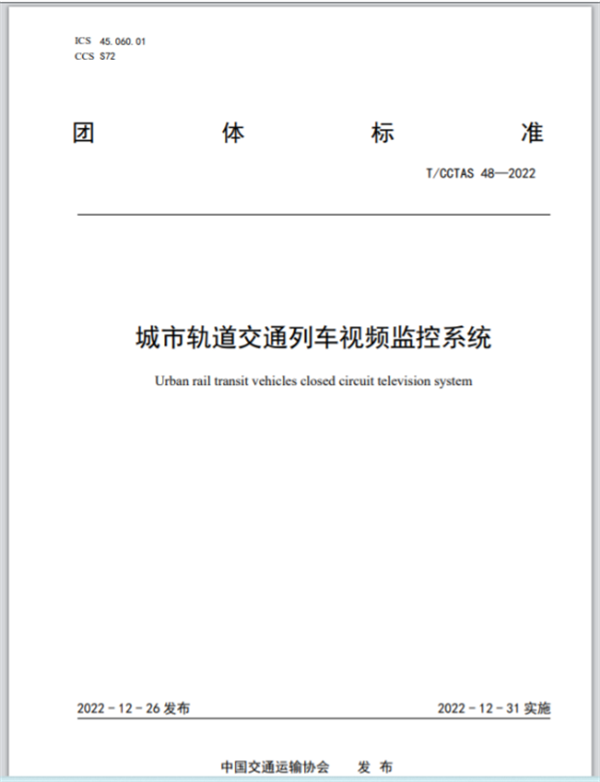《城市軌道交通列車視頻監(jiān)控系統(tǒng)》由中國交通運輸協(xié)會新技術(shù)促進分會提出,由中車青島四方機車車輛股份有限公司牽頭,聯(lián)合中車南京浦鎮(zhèn)車輛有限公司、鄭州地鐵集團有限公司運營分公司、濟南軌道交通集團有限公司建設(shè)投資公司、蘇州華啟智能科技有限公司、天津市北海通信技術(shù)有限公司、中車成都機車車輛有限公司、北京貝能達信息技術(shù)股份有限公司、北京航空航天大學(xué)、中交協(xié)聯(lián)交通科學(xué)研究院(北京)有限公司等十家單位共同起草,于2022年12月26日發(fā)布、12月31日起實施。該標(biāo)準(zhǔn)規(guī)定了城市軌道交通列車視頻監(jiān)控系統(tǒng)的使用條件、技術(shù)要求、檢驗方法、檢驗規(guī)則及標(biāo)志、包裝、運輸和儲存等,為城市軌道交通車輛列車視頻監(jiān)控系統(tǒng)的開發(fā)和應(yīng)用提供了技術(shù)支撐。