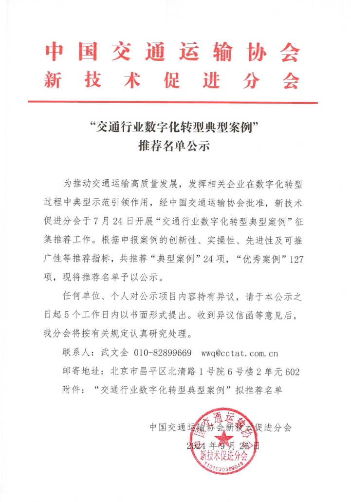 “交通行業(yè)數(shù)字化轉(zhuǎn)型典型案例”推薦名單公示